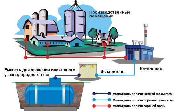 Система газоснабжения предприятия представляет собой комплекс из резервуаров для хранения сжиженного газа, насосное и испарительное оборудование. Именно такая газификация промышленных объектов применяется и в случае отсутствия магистрального газопровода как такового - именно поэтому оно называется автономное газоснабжение предприятий.